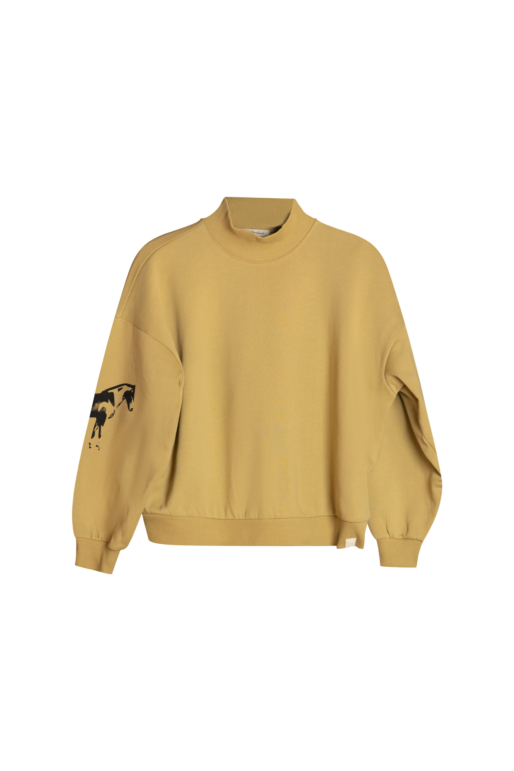 Reine is a boxy, turtle-necked sweatshirt. Very comfy in an oversized model with raglan sleeves. Unique with a black, graphic horse print on the right arm. Comes in organic cotton in colors warm yellow and green.